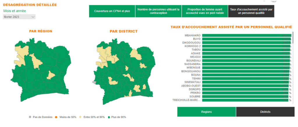 Example 2 – Rates of deliveries assisted by a skilled birth attendant by region and district in Ivory Coast showing that not one district had lower than 50% rates in March 2023.