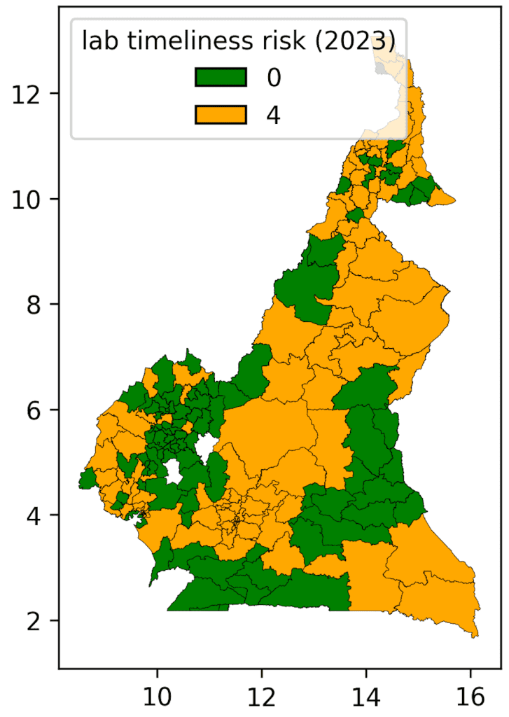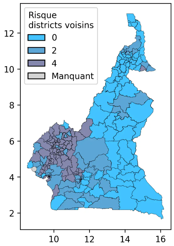 A second dimension of this project has been to map the risk of measles outbreak emergence, by providing insights on some elements that combine to heighten or diminish this risk. Using WHO’s risk assessment approach we computed maps that rate health areas on dimensions such the number of neighbouring districts with malaria cases, the speed of measles cases confirmation or populations vaccination rates.