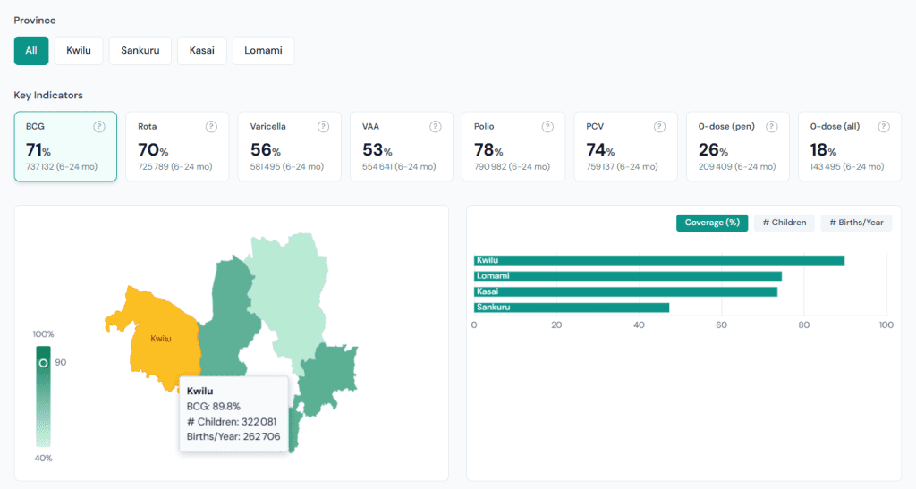 With an under-5 mortality rate nearing 8%, the Democratic Republic of the Congo (DRC) faces a critical public health challenge, where vaccine-preventable diseases remain a leading cause of child deaths. To address this crisis, the ImmuReach (Immunisation in DRC: Reaching Missed Communities) project was launched. Led by Bluesquare, in collaboration with the Université Libre de Bruxelles (ULB) and the University of Kinshasa (Unikin), the project aims to build operational, data-driven models that identify under-immunized populations and optimize the allocation of healthcare resources.