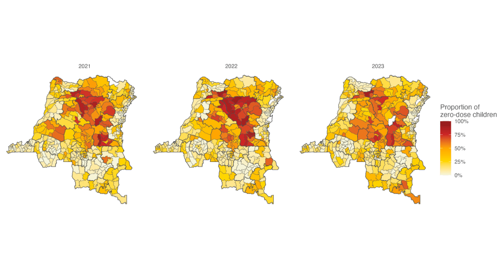 Spatial analyses reveal that zero-dose children are significantly clustered in the central equatorial forest regions of the DRC. The models demonstrate that zero-dose status is strongly correlated with a lack of uptake for other key childhood vaccines, such as those protecting against polio, rotavirus, and pneumococcal infections. This correlation indicates that under-immunization often reflects broader, systemic gaps in access to routine healthcare services rather than isolated instances of vaccine refusal.