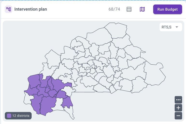 Users define intervention packages (LLINs, IRS, SMC, treatment strategies, etc.) and assign them to districts or population groups based on risk profiles, operational feasibility, and programmatic priorities. Multiple planning scenarios can be created and compared, allowing NMPs to explore different coverage targets, combinations of interventions, or prioritization strategies.